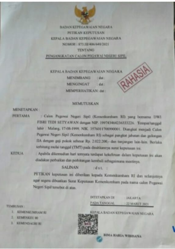 “Didalam bukti-bukti surat tersebut ada Keterangan Lulus Badan Kepegawaian Negara No. SK :83/PANPELBKN/CPNS/XII/ 2020.