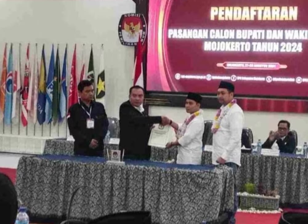 “Pasangan MUBAROK menjadi pendaftar pertama. Tadi dicek tim kami, berkas pendaftaran sudah dinyatakan lengkap. Selanjutnya, mulai besok pemeriksaan kesehatan di RSUD Dr Soetomo, Surabaya,” kata Ketua KPU Kabupaten Mojokerto Afnan Hidayat kepada wartawan di lokasi, Jalan RAAK Adinegoro, Sooko, Rabu (28/8/2024).