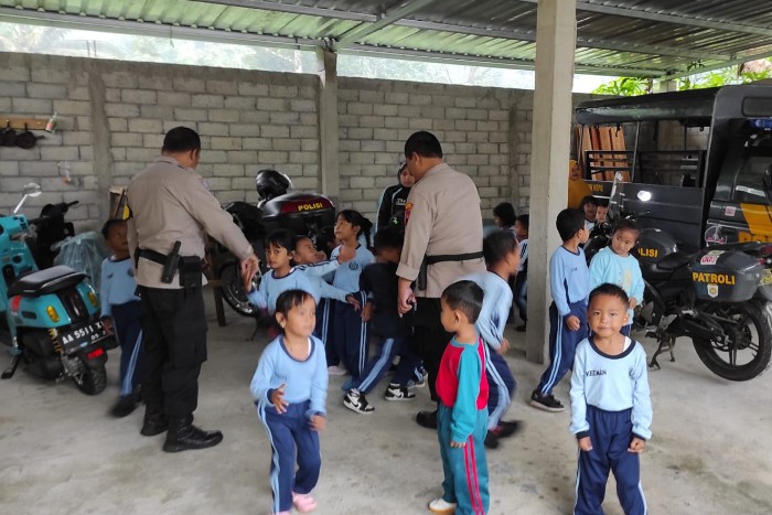 “Selain kami perkenalkan pada mobil dan motor dinas, anak-anak juga kami ajak berkeliling Mapolsek untuk mengetahui setiap ruangan,” ungkap Aiptu Sulis.