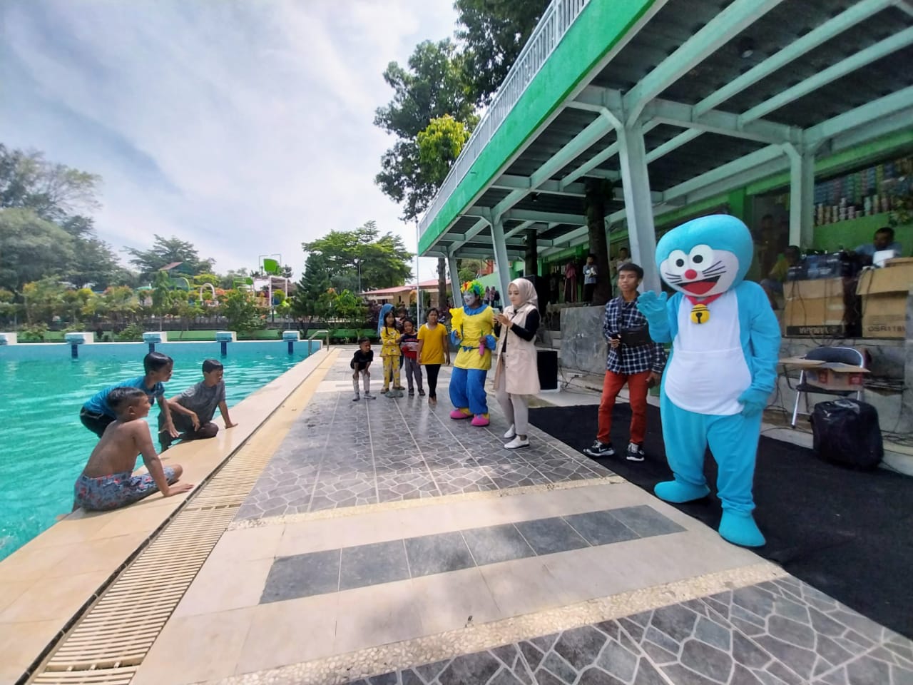 “Ini yang ngajak cucu tadi. Mumpung liburan, mbak. Ini ajak anak cucu buat ke sini main air. Ada hiburan badut juga. Itu habis dapat balon,” pungkasnya.