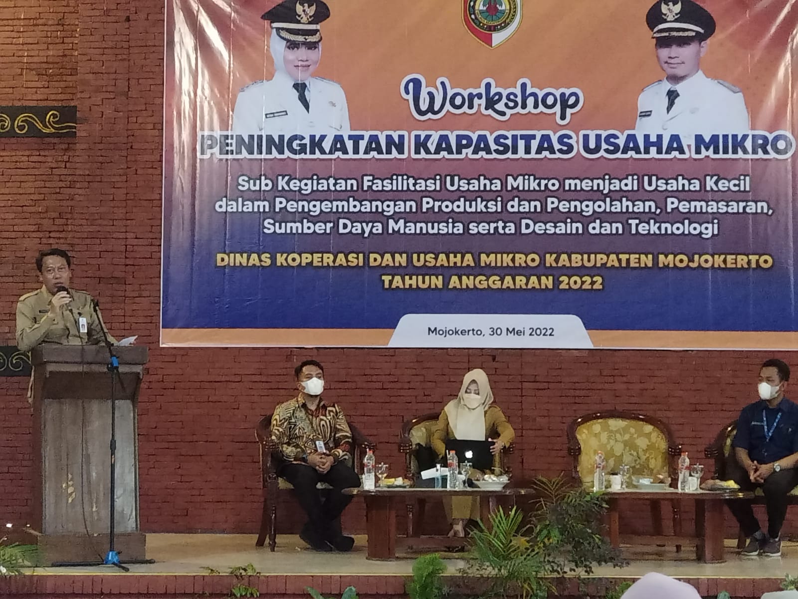 Kepala Dinas Koperasi dan UMKM Kabupaten Mojokerto, H. Abdulloh Muhtar, S.Sos, MM, menyelenggarakan Workshop Peningkatan Kapasitas Usaha Mikro Sub Kegiatan Fasilitas Usaha Mikro Menjadi Usaha Kecil dalam pengembangan produksi dan pengelohan, Pemasaran, Sumber Daya Manusia serta Desain dan Teknologi tahun Anggaran 2022, bertempat di Graha Mulyo Jati Mojopahit Mojokerto lingkungan Wisata Desa BMJ Mojopahit Mojokerto, Senin ( 30 / 05 / 2022 ) yang langsung dihadiri oleh Bupati Mojokerto dr Ikfina Fahmawati, M.Si.