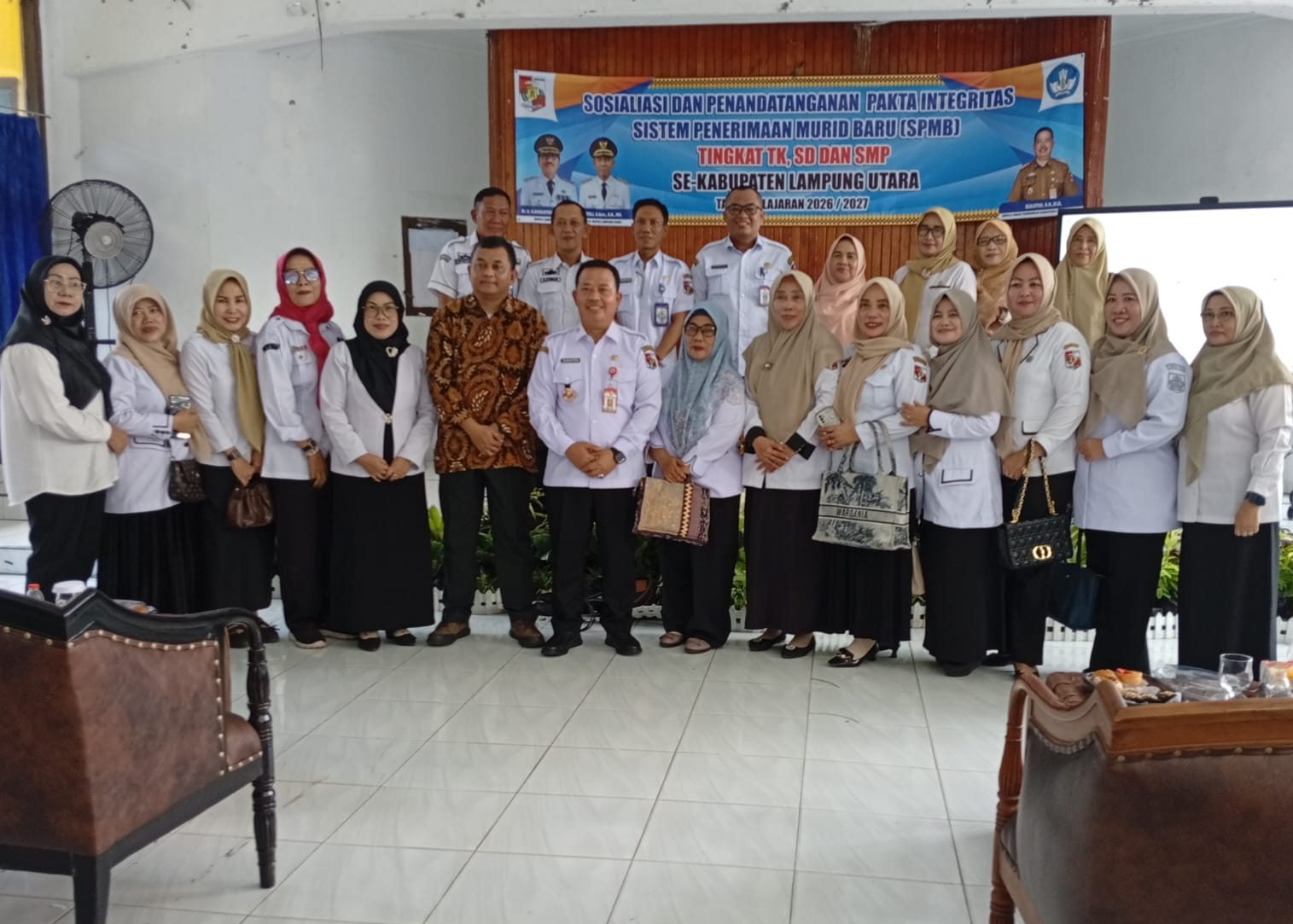Dinas Pendidikan (Disdik) Kabupaten Lampung Utara menggelar sosialisasi sekaligus penandatanganan Pakta Integritas Sistem Penerimaan Murid Baru (SPMB) Tahun Ajaran 2026 untuk jenjang TK, SD, dan SMP se-Kabupaten Lampung Utara. Kegiatan dipusatkan di Gedung Korpri Kotabumi, Rabu (22/4/2026).