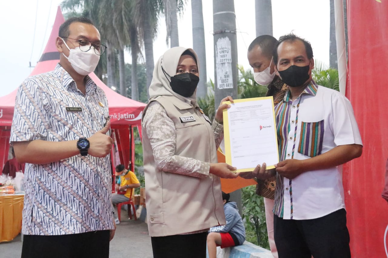 Setelah memberikan sambutan, Bupati Mojokerto Ikfina Fahmawati memberikan sertifikat Halal kepada 38 pelaku usaha dan sertifikat merek dagang kepada 77 pelaku usaha Industri Kecil Menengah ( Kartono )