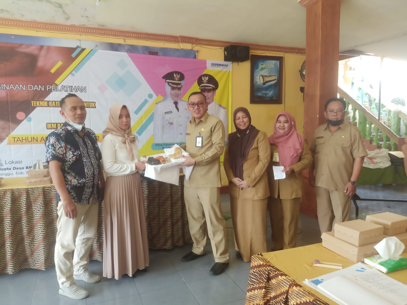 “Saya berharap, IKM Pengrajin batik tulis di Mojokerto itu bisa berjalan dan terus meningkat.” Jadi para peserta semuanya ini dibekali alat bantu produksi berupa satu set peralatan untuk batik tulis, batik cap berikut canting dan kelengkapannya, dan kain berukuran 12 meter. “Dengan pelatihan ini ke depannya para peserta dapat mengembangkan ilmu pengetahuan nya masing-masing untuk membuka peluang dan menonjolkan potensi lokal untuk dijadikan desain atau motif batik,” pesan Abah Iwan