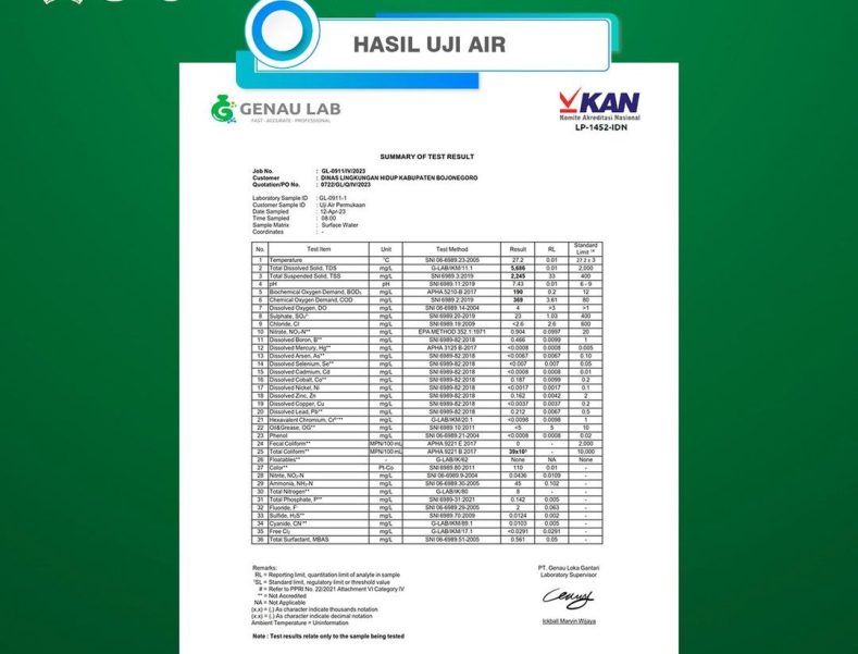 Kepala DLH Bojonegoro Dandi Suprayitno menyampaikan pihaknya telah melakukan peninjauan lokasi beberapa waktu lalu dan melakukan pengujian analisa kandungan air. Hasilnya menunjukkan ada beberapa parameter analisa air di Desa Jari Kecamatan Gondang parameter telah melampaui baku mutu / ambang batas sesuai dengan PP Nomor 22 Tahun 2021 Lampiran VI.
