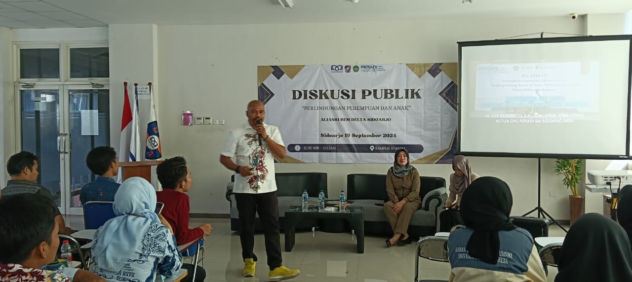 Dewan Pimpinan Cabang (DPC) PERADI SAI Sidoarjo bekerjasama dengan Unit Perlindungan Perempuan dan Anak (PPA) Polresta Sidoarjo serta Aliansi BEM Delta sukses menggelar Diskusi Publik bertema “Perlindungan Perempuan dan Anak. Kamis, 19 September 2024. Acara yang berlangsung di Gedung Serba Guna, lantai 3, STAI An Najah Indonesia Mandiri (STAINIM) Sidoarjo ini bertujuan untuk meningkatkan pemahaman masyarakat terkait kekerasan dalam rumah tangga (KDRT) dan kekerasan seksual.