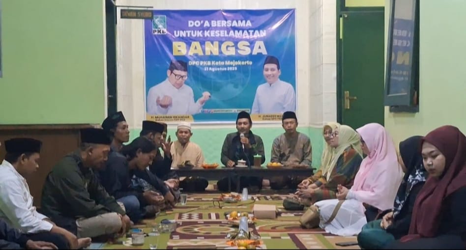 Untuk itu seluruh jajaran pengurus DPC PKB Kota Mojokerto dan Anggota Fraksi PKB DPRD Kota Mojokerto, bersama para Ketua PAC, Ranting, dan Banom-nya mengelar acara Doa Bersama di Kantor DPC PKB Kota Mojokerto, Jalan Raya Brawijaya Kelurahan Mentikan Kecamatan Prajurit Kulon, Ahad Malam, ( 31 / 08 / 2025 ).