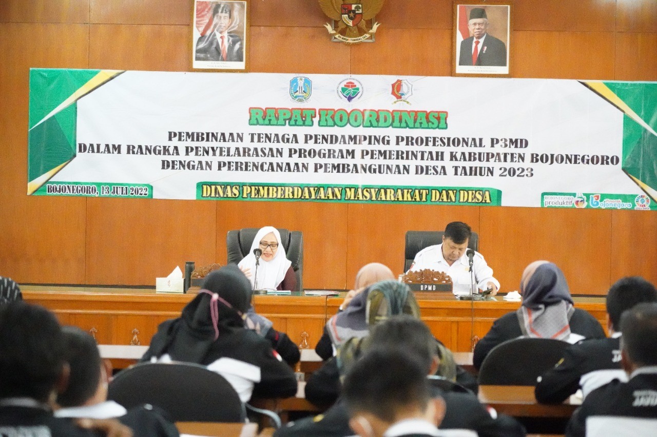 Pemerintah Kabupaten (Pemkab) Bojonegoro melalui Dinas Pemberdayaan Masyarakat dan Desa (DPMD) menyelenggarakan Rapat Koordinasi Pembinaan Tenaga Pendamping Profesional Program Pembangunan dan Pemberdayaan Masyarakat Desa (P3MD) Se-Kabupaten Bojonegoro. Kegiatan ini dalam rangka penyelarasan program Pemkab Bojonegoro dengan Perencanaan pembangunan Desa tahun 2023. Rakor digelar di Ruang Pertemuan Angling Dharma pemkab Bojonegoro, Rabu (13/07/2022)