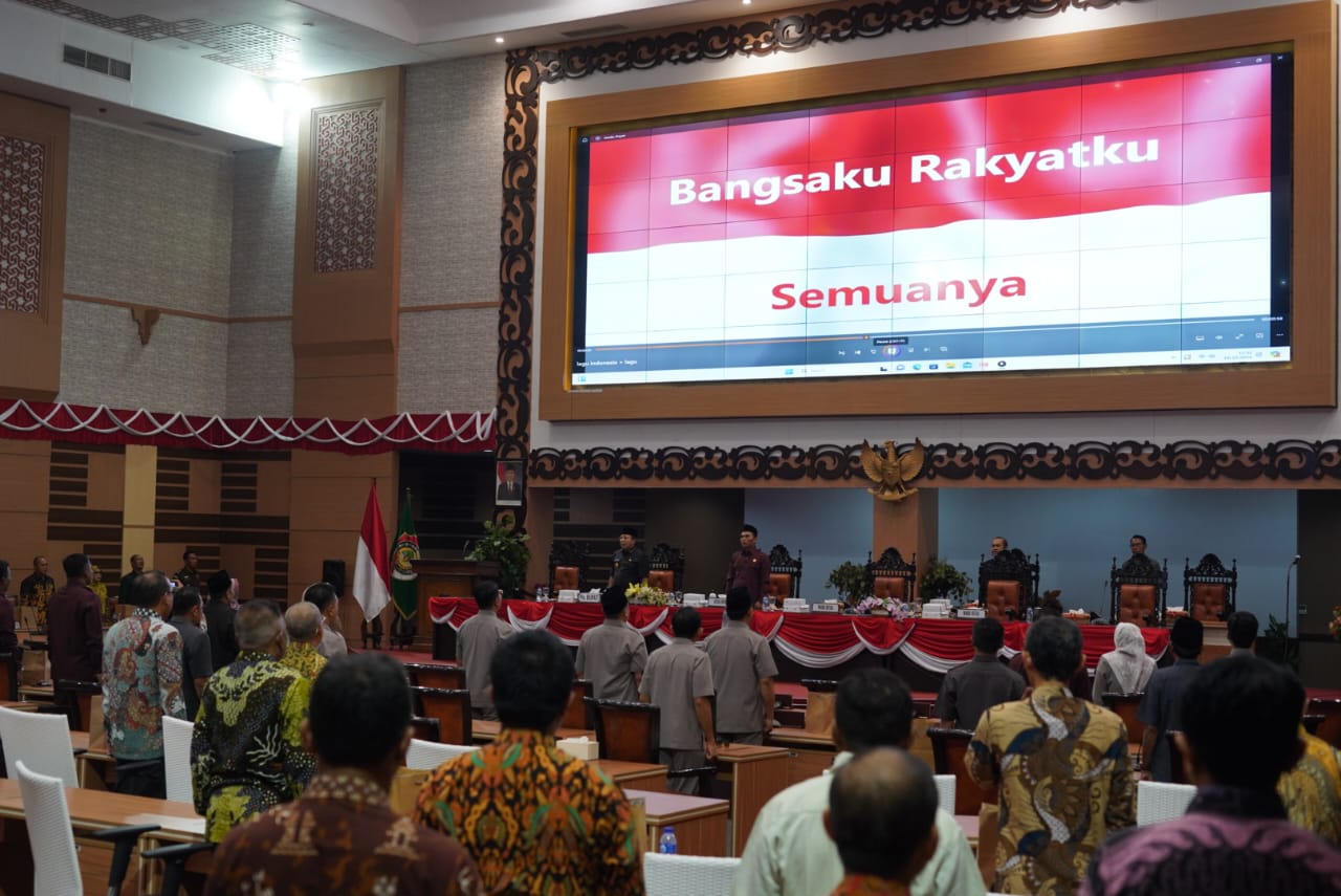 Dewan Perwakilan Rakyat Daerah (DPRD) Kabupaten Mojokerto menggelar Rapat Paripurna dengan agenda lanjutan untuk mendengarkan jawaban Bupati Mojokerto atas pandangan umum Fraksi-fraksi terhadap Raperda tentang APBD ( TA ) tahun anggaran 2025 di ruang rapat Graha Whicesa Gedung utama DPRD Kabupaten Mojokerto, Senin pagi (21/10/2024).
