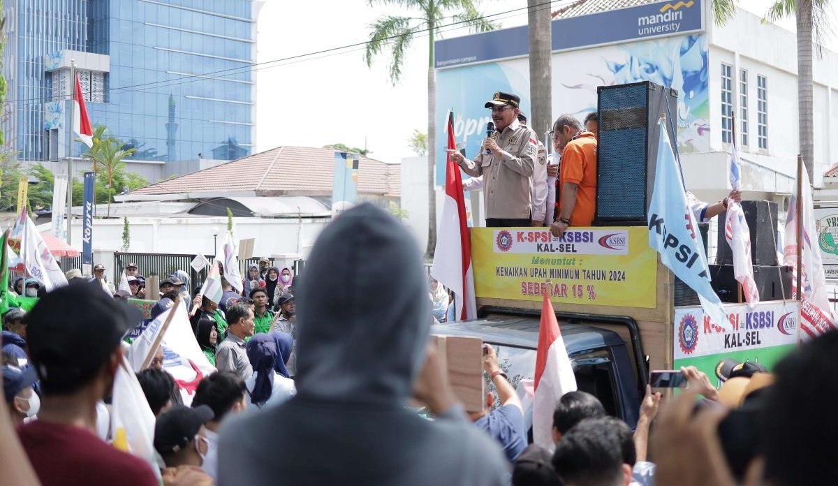 Ketua Biro Hukum KSPSI Kalsel, Sumarlan, yang merupakan salah satu juru bicara aksi tersebut menuntut kenaikan Upah Minimum Provinsi (UMP) Kalsel 2024 sebesar 15 persen.