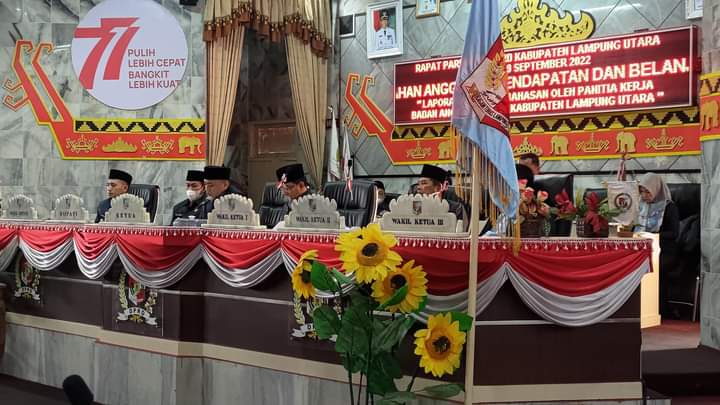 Dewan Perwakilan Rakyat Daerah (DPRD) Kabupaten Lampung Utara menggelar Sidang Paripurna mengenai Pembahasan Nota Keuangan atas Rancangan Perubahan APBD dan Raperda Kabupaten Lampung Utara tentang Perubahan Anggaran Pendapatan dan Belanja Daerah (APBD) Kabupaten Lampung Utara Tahun Anggaran 2022. Jum’at, (09/09/2022).