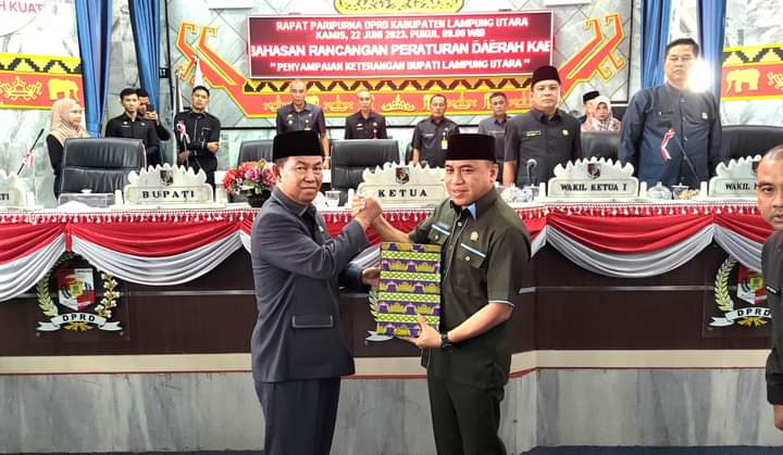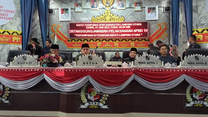 Bupati Lampung Utara, H. Budi Utomo dalam sambutan Menyampaikan Laporan Pertanggung jawaban Pelaksanaan APBD Kabupaten Lampung Utara tahun anggaran 2022.