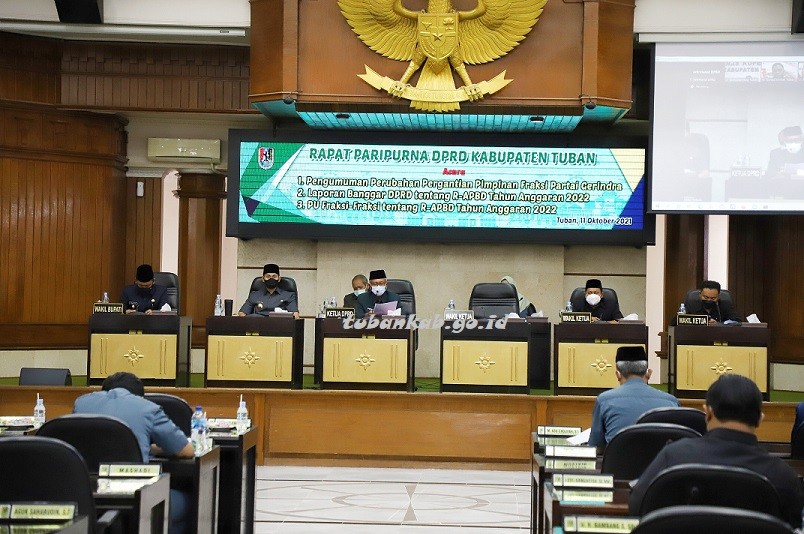 DPRD Kabupaten Tuban menggelar rapat paripurna dengan agenda pengumuman perubahan pergantian pimpinan fraksi Partai Gerindra, laporan Banggar DPRD tentang R-APBD TA 2022 dan PU fraksi-fraksi tentang R-APBD TA 2022, di ruang rapat paripurna DPRD setempat, Senin (11/10).