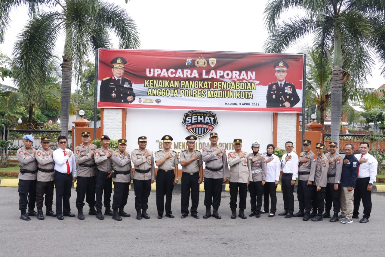 Kepolisian Resor Madiun Kota menggelar upacara kenaikan pangkat pengabdian pada dua perwiranya dihalaman apel Mapolres Madiun Kota, Senin (3/4/2023) pagi.