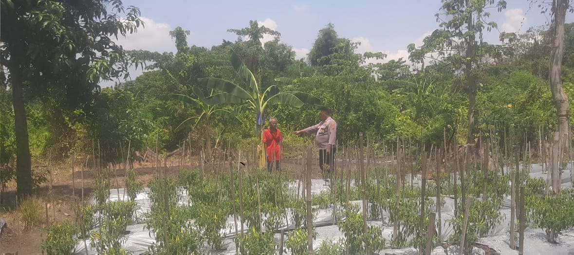 Bhabinkamtibmas Desa Banjarbendo tersebut bersama perangkat desa mendatangi Pekarangan Pangan Bergizi (P2B), dengan sistem hidroponik berupa tanaman cabai dan terong yang dikembangkan oleh warga setempat.