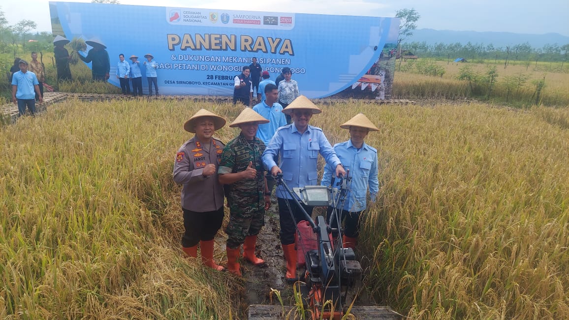 Kapolres Wonogiri, AKBP Jarot Sungkowo, S.H., S.I.K., turut menghadiri kegiatan panen raya padi dan pemberian dukungan modernisasi alat pertanian yang diadakan di lahan Pertanian Desa Sirnoboyo, Kecamatan Giriwoyo, Kabupaten Wonogiri, Jumat (28/2/2025).