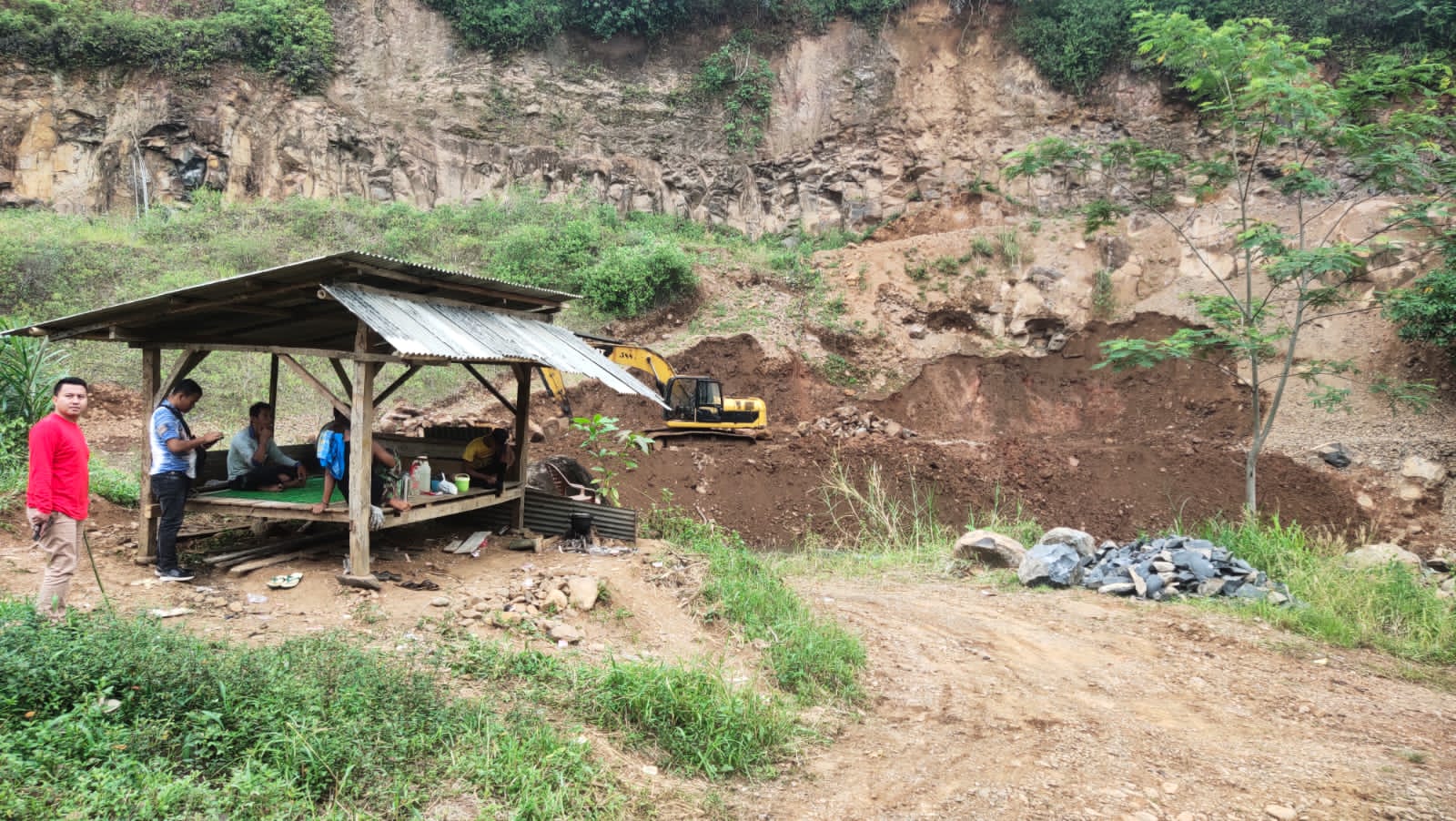 Benar saja, saat tim berada di lokasi didapati aktifitas penambangan Batu di duga ilegal dengan pekerja berjumlah empat orang menggunakan satu unit kendaraan alat berat eksavator, kemudian kita lakukan interogasi.