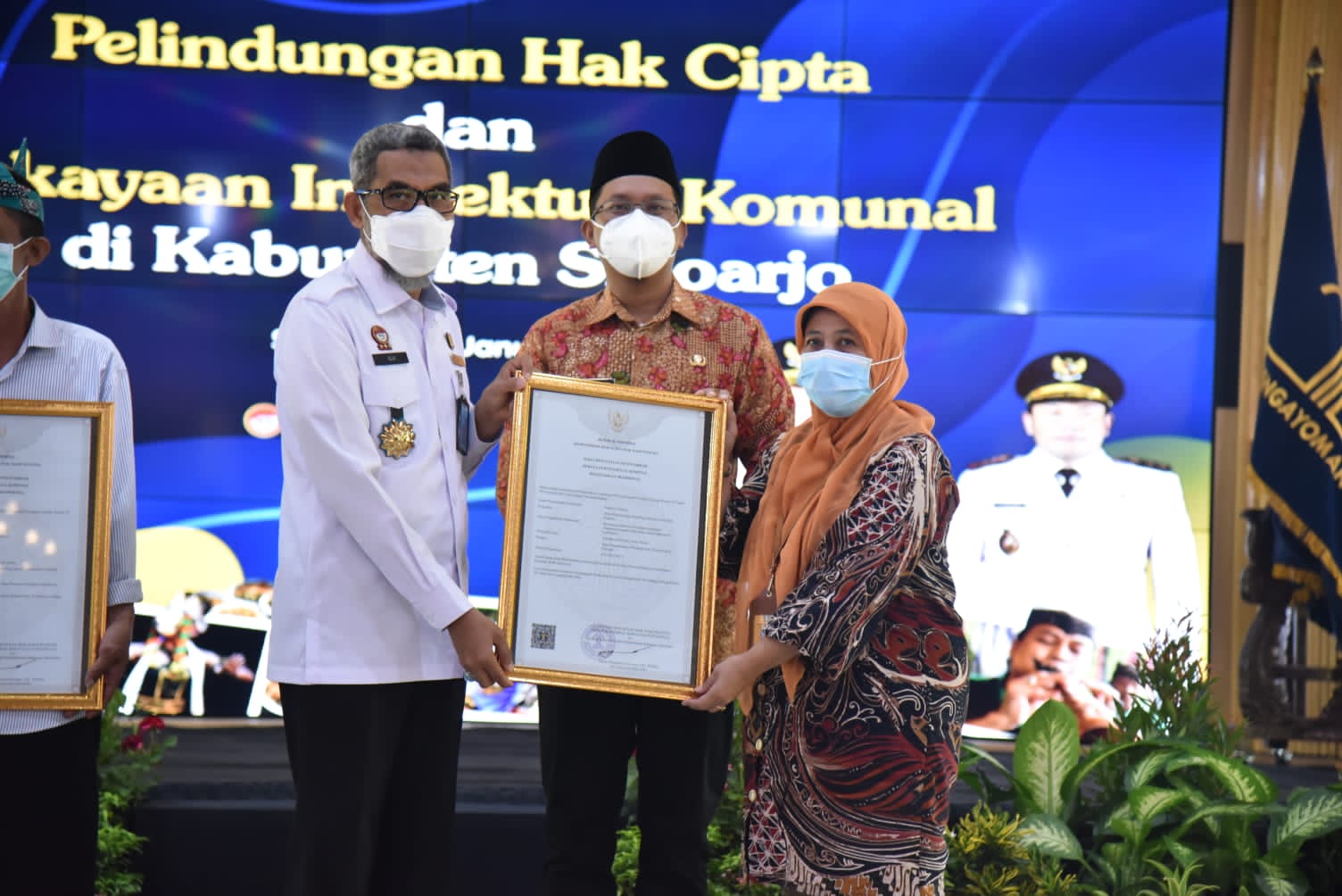 Pemkab Sidoarjo mencatatkan produk kupang lontong, tari Banjar Kemuning, musik Patrol dan udeng Pacul Gowang dalam Hak Kekayaan Intelektual (HKI) di Dirjen Kekayaaan Intelektual Kemenkumham RI. Pagi tadi surat pencatatan inventaris Kekayaan Intelektual Komunal Dirjen Kekayaaan Intelektual Kemenkumham RI diserahkan langsung oleh Plt. Dirjen Kekayaan Intelektual Ir. Razilu M.Si kepada 4 orang komunitas usaha yang didampingi Bupati Sidoarjo H. Ahmad Muhdlor S.IP di pendopo Delta Wibawa, Jumat (14/1).