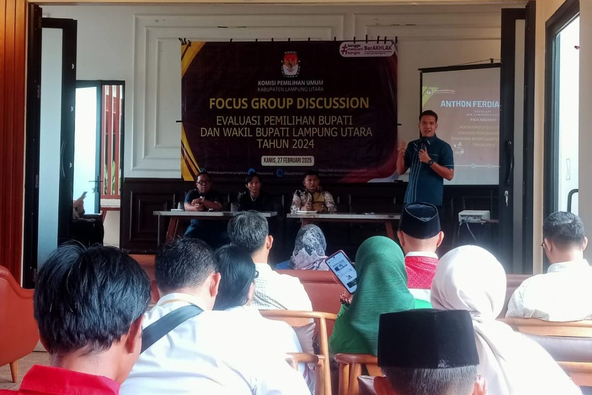 Komisi Pemilihan Umum (KPU) Kabupaten Lampung Utara melaksanakan Focus Group Discussion (FGD) Evaluasi Pemilihan Bupati dan Wakil Bupati Lampung Utara tahun 2024, di Kiyo Time Cafe and Resto, Kelapa Tujuh, Kotabumi Selatan, Kamis 27 Febuari 2025.