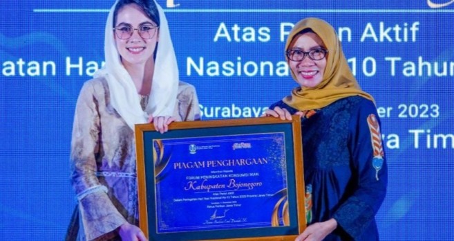 Forum Peningkatan Konsumsi Ikan (FORIKAN) Kabupaten Bojonegoro terima penghargaan dari FORIKAN Jawa Timur pada peringatan Hari Ikan Nasional Tahun 2023 Provinsi Jatim, penghargaan diberikan langsung oleh Ketua FORIKAN Prov. Jawa Timur Arumi Bachsin kepada Ketua FORIKAN Kab. Bojonegoro Dian Adiyanti Adriyanto.