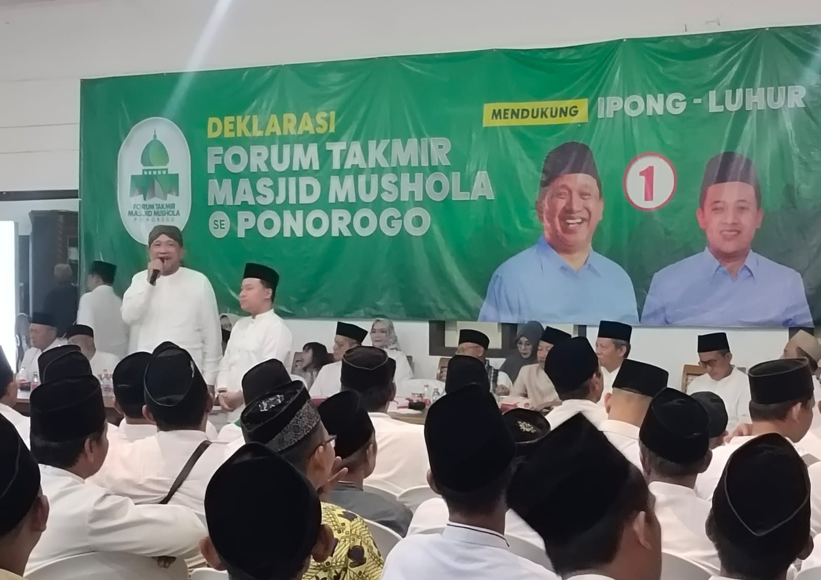 Dukungan besar diberikan oleh Forum Takmir Masjid dan Musholla se-Kabupaten Ponorogo kepada pasangan calon bupati dan wakil bupati nomor satu, Ipong Muchlissoni-Segoro Luhur, dalam Pilkada Ponorogo 2024. Sedikitnya 680 orang hadir di Posko Pemenangan Ipong-Luhur di Pasar Pon, Senin malam, 11 November 2024, untuk mendeklarasikan komitmen mereka memenangkan Ipong-Luhur pada 27 November mendatang.
