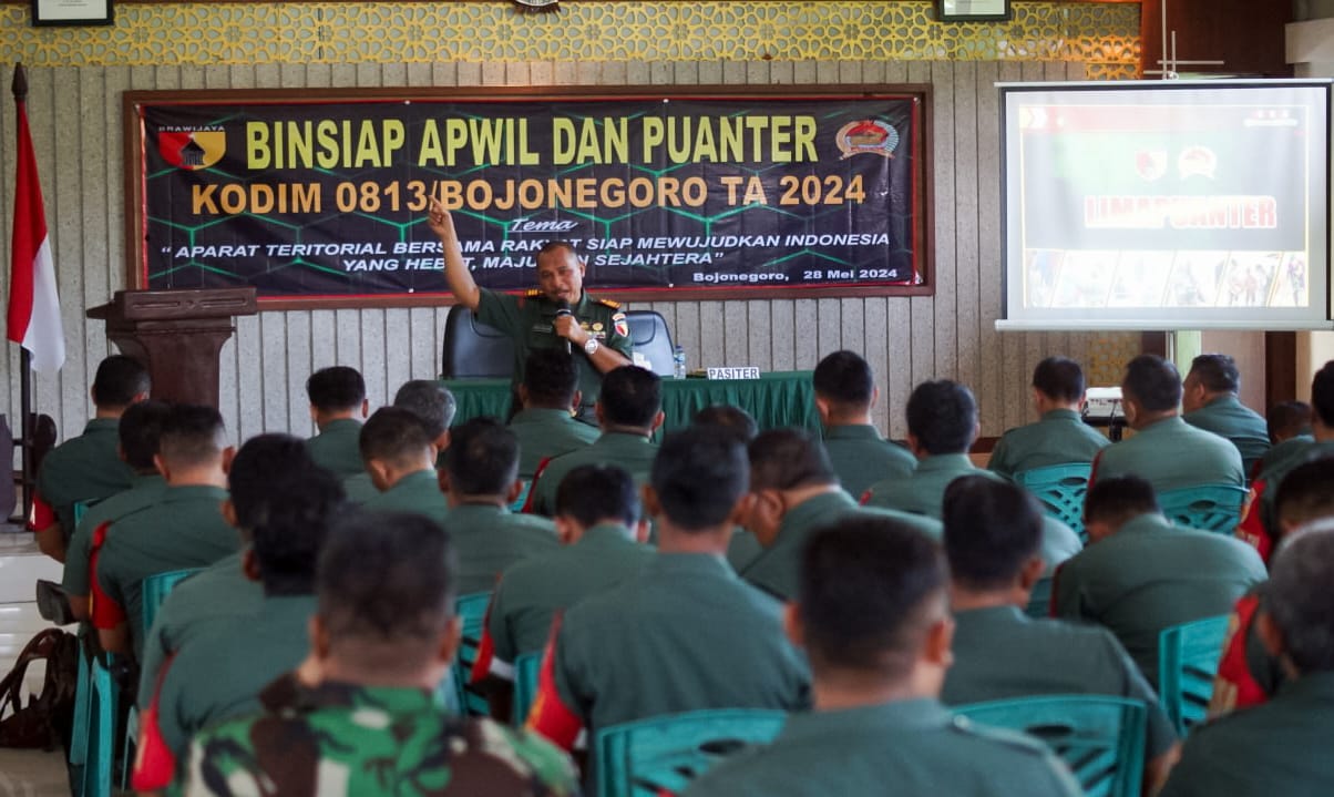 Dalam rangka meningkatkan pengetahuan dan kemampuan personel Babinsanya, Komando Distrik Militer (Kodim) 0813 Bojonegoro Jawa Timur menggelar kegiatan Pembinaan Kesiapan Aparat Kewilayahan (Binsiap Apwil) dan Kemampuan Teritorial (Puanter) di Gedung Ahmad Yani Makodim setempat, Rabu (12/6/2024).