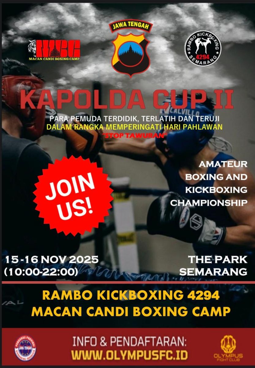 Dalam rangka memperingati Hari Pahlawan pada 10 November 2025 mendatang, Polda Jawa Tengah kembali menggelar ajang bergengsi Kejuaraan Tinju dan Kickboxing Amatir “Kapolda Cup 2”. Kegiatan ini akan berlangsung di Atrium Utama The Park Semarang, Jl. Madukoro Raya, Semarang Barat pada 15–16 November 2025 mendatang.