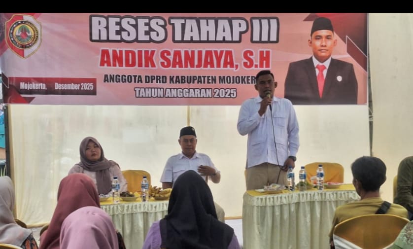 Anggota DPRD Kabupaten Mojokerto dari Fraksi Gerindra Mas Andik menggelar Serap Aspirasi Masyarakat atau Reses tahap III tahun 2025, Minggu pagi (14 /12/2025 ) di Desa Blimbingsari Kecamatan Sooko Kabupaten Mojokerto Didampingi Tokoh Masyarakat Gus Sodik.