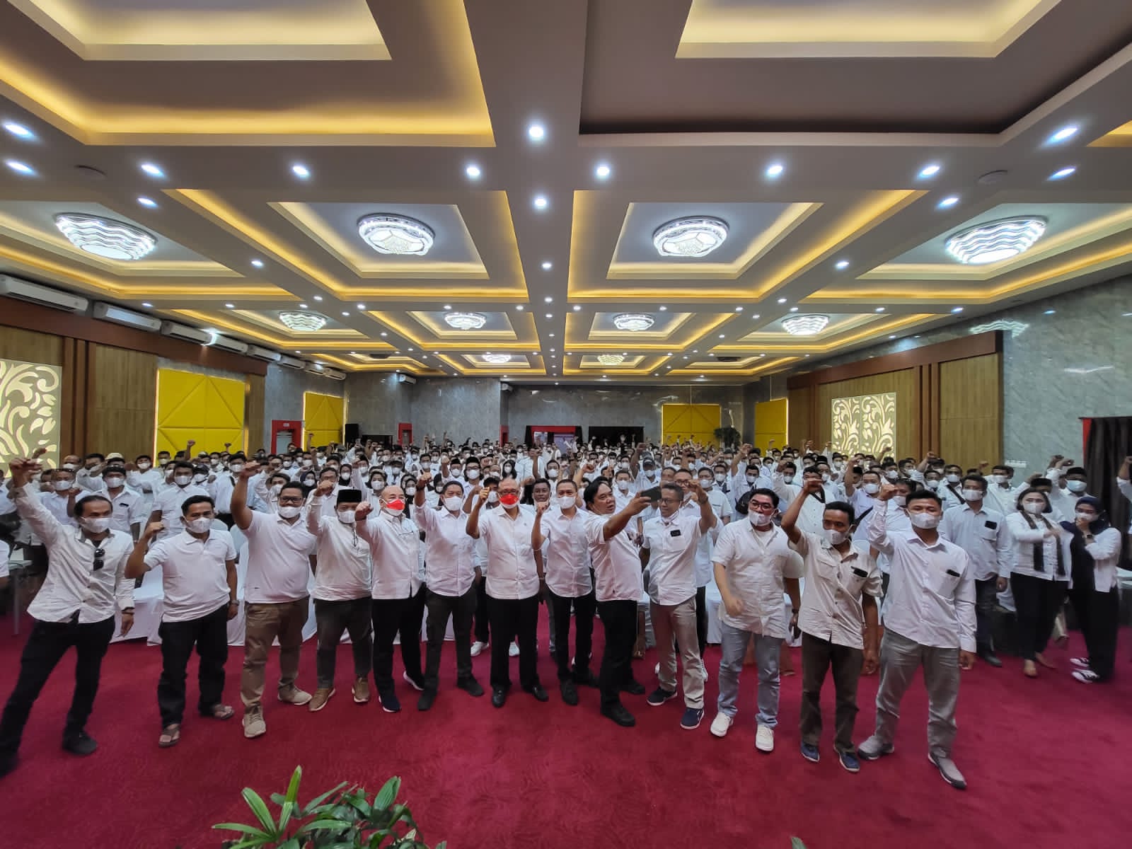 Relawan Jokowi Plat K meneguhkan sikap mendeklarasikan untuk tegak lurus setia 2024 bersama Presiden Joko Widodo (Jokowi), dalam acara Silahturahmi Daerah (Silatda) eks karesidenan Pati Plat K yang terdiri dari kabupaten Pati, Rembang, Grobogan, Blora, Kudus, Jepara.