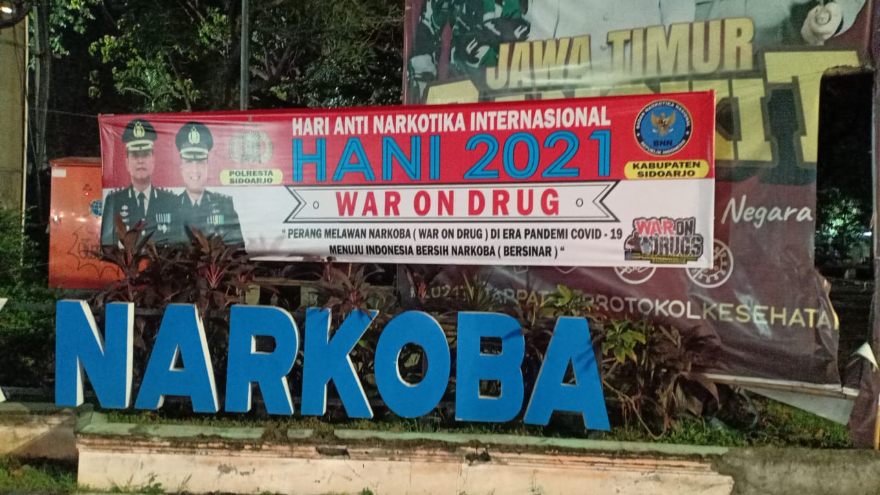 Jelang peringatan Hari Anti Narkotika Internasional (HANI 2021), Polresta Sidoarjo memasang banner perang terhadap narkoba. Sebagai gerakan bersama guna mengingatkan masyarakat jangan terlibat dalam penyalahgunaan narkoba.