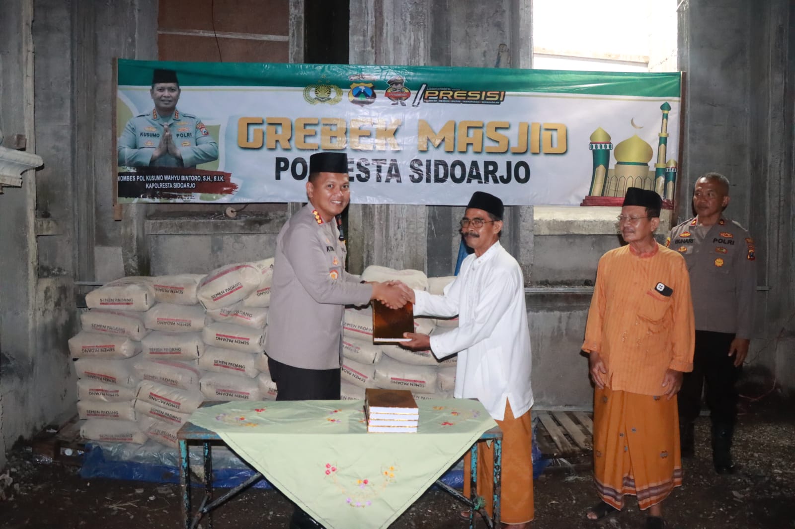 “Kedatangan kami ke Desa Kedung Rejo dan Desa Waru, Kecamatan Waru kali ini, selain bersilaturahmi juga dalam rangka kegiatan Gerebek Masjid menyalurkan bantuan material pembangunan mushola di sini serta memberikan paket sembako kepada warga untuk berbagi kebahagiaan jelang Idul Fitri,” ujar Kapolresta Sidoarjo Kombes Pol. Kusumo Wahyu Bintoro.
