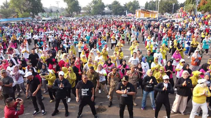 Gubernur Lampung didampingi Ketua Umum Perwosi Provinsi Lampung Riana Sari, Pj. Bupati Lampung Utara Aswarodi, bersama ribuan masyarakat yang hadir memadati halaman Stadion Sukung melakukan Senam Lampung Berjaya.