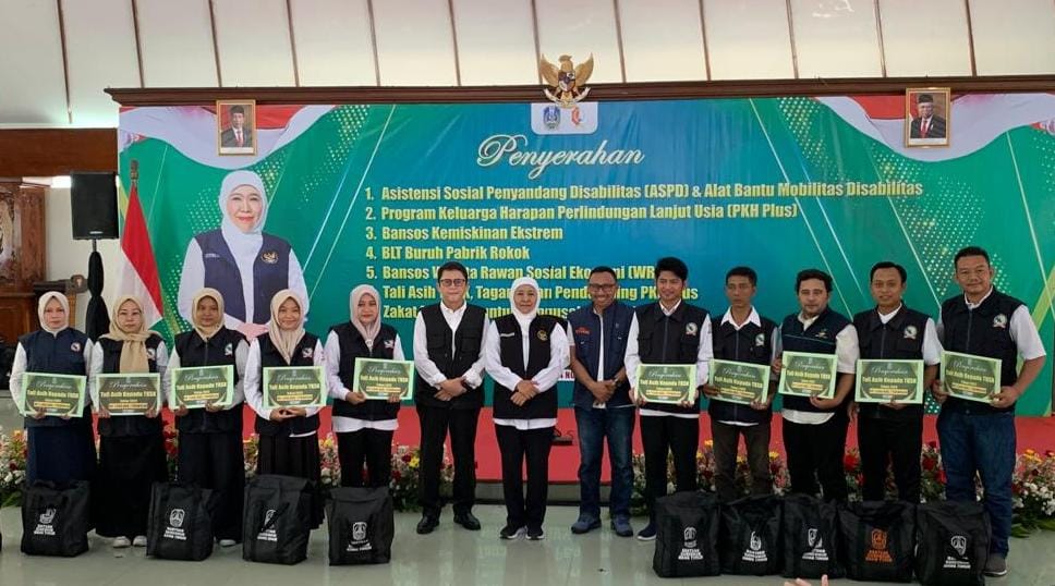 Dinas Sosial (Dinsos) Provinsi Jawa Timur menyalurkan bantuan sosial (bansos) Dinsos Provinsi Jatim dan menyerahkan tali asih di Pendopo Pemkab Bojonegoro, Sabtu (4/11/2023). Penyerahan secara simbolis oleh Gubernur Jatim Khofifah Indar Parawansa ini juga untuk Bantuan Operasional Penyelenggaraan (BOP) kepada TKSK (Tenaga Kesejahreraan Sosial Kecamatan), TAGANA, dan SDM PKH Plus.