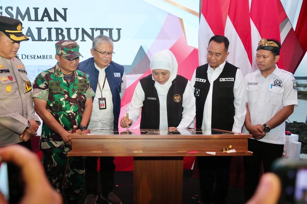 Gubernur Jawa Timur Khofifah Indar Parawansa meresmikan Bangunan Pengendali Banjir Rob berupa Pintu Air dan Parapet di Desa Kalibuntu, Kecamatan Kraksaan, Kabupaten Probolinggo, Senin (25/12/2023).