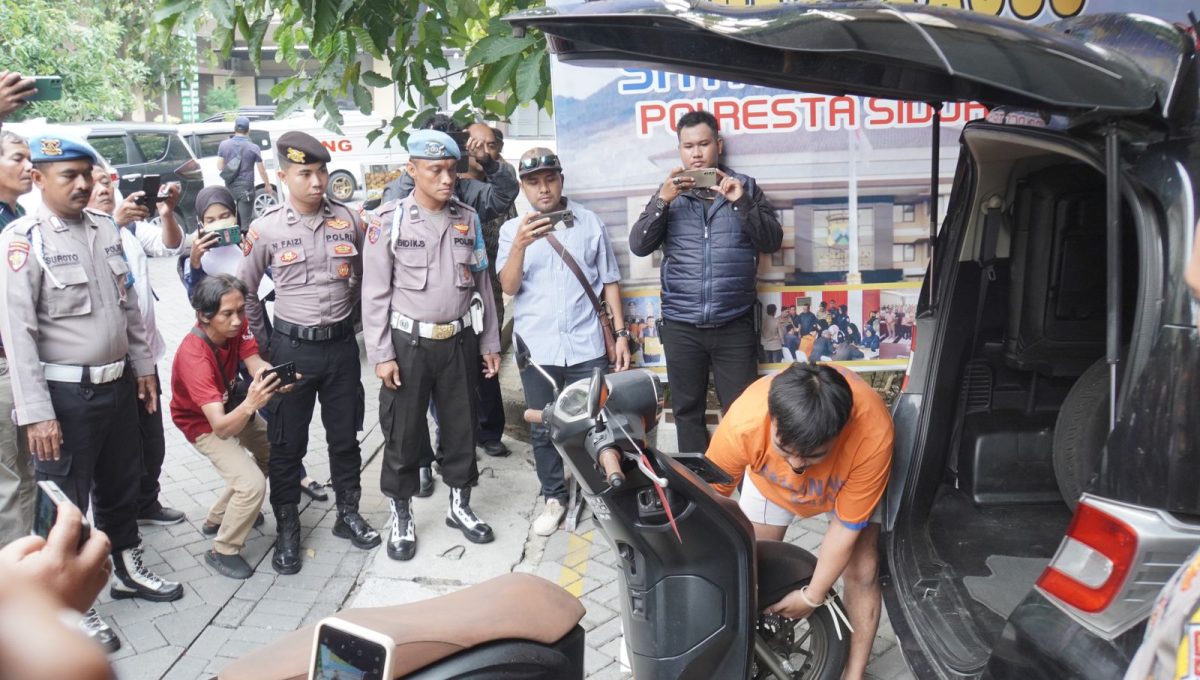 M.M.O., pria 36 tahun, asal Pare, Kediri, diringkus anggota Satreskrim Polresta Sidoarjo karena dua kali melakukan tindakan pencurian kendaraan bermotor di tempat parkir Apartemen Prospero dan Sun Hotel Sidoarjo.