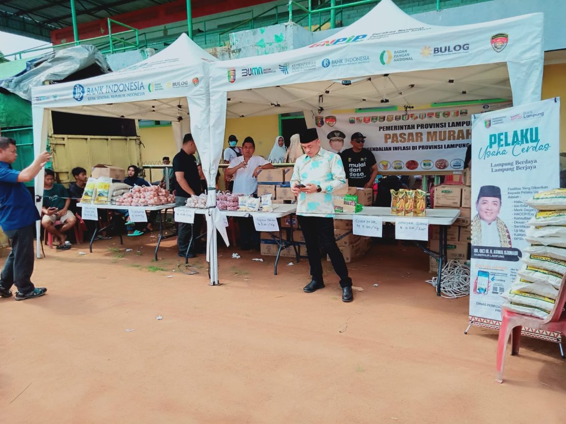 Sebelum pelaksanaan Pengajian Akbar, terlebih dahulu Gubernur Lampung Arinal Djunaidi meninjau pelaksanaan Operasi Pasar Murah dan menyerahkan bantuan sembako pada masyarakat Peserta Pengajian yang telah lanjut usia.