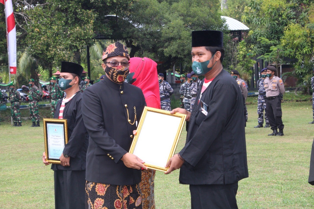 Tampak pula Kapolres Bangkalan AKBP Alith Alarino, S.I.K. yang hadir didampingi istri tercinta Ny. Novi Alith Alarino yang juga ketua Bhayangkari Cabang Bangkalan lengkap menggunakan pakaian adat Bangkalan yakni Agungan. Upacara yang berlangsung khidmat itu pun berjalan dengan baik. Selepas upacara, Kapolres Bangkalan AKBP Alith Alarino, S.I.K. juga memberikan penghargaan secara simbolis kepada 54 kepala desa dari 18 kecamatan di Bangkalan yang telah mencapai pelunasan Pajak Bumi dan Bangunan (PBB) tahun 2021.