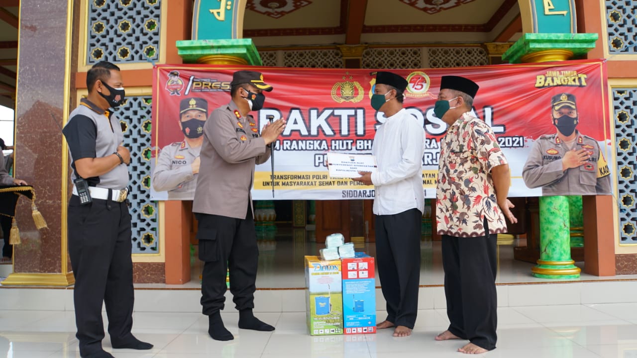 “Pada kesempatan Hari Bhayangkara ke-75 tahun 2021, kami hadir mengedukasi para pengurus tempat ibadah, seperti masjid, gereja, klenteng dan pura untuk ikut serta tiada henti mengingatkan masyarakat selalu mematuhi protokol kesehatan pencegahan Covid-19,” jelas Kapolresta Sidoarjo AKBP Kusumo Wahyu Bintoro.
