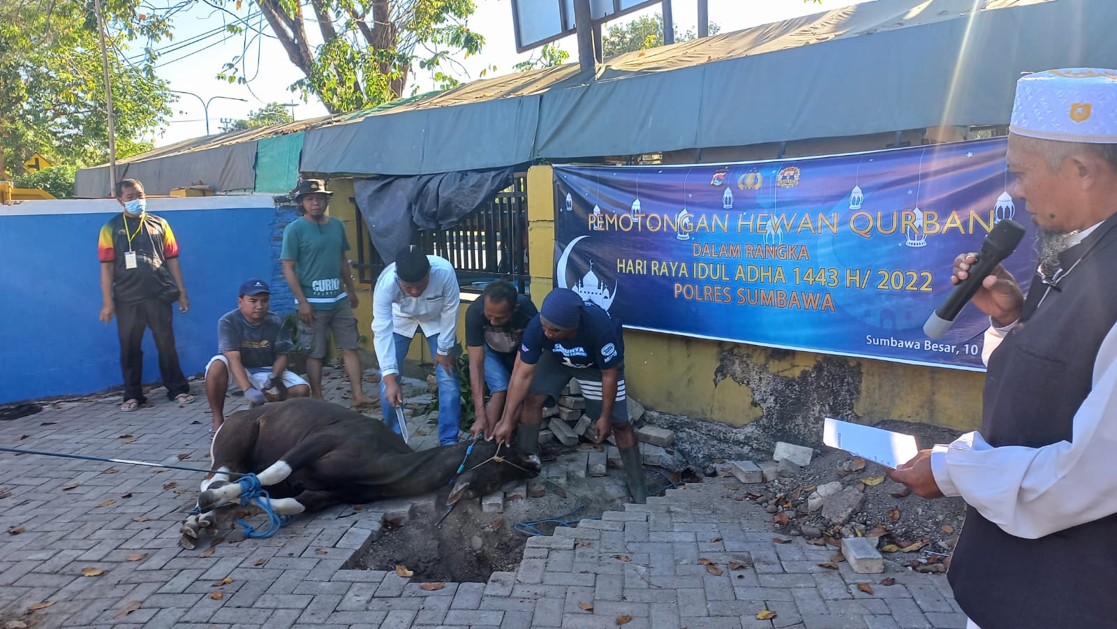 Polres Sumbawa pada Idul Adha 1443 H Tahun 2022 ini memotong hewan kurban sebanyak 9 ekor sapi. Pemotongan hewan kurban berlangsung usai Sholat Ied di halaman parkir Polres Sumbawa, Minggu, (10/7/2022). Menariknya, Kapolres Sumbawa bertindak sebagai salah satu penjagal dalam pemotongan hewan kurban tersebut.