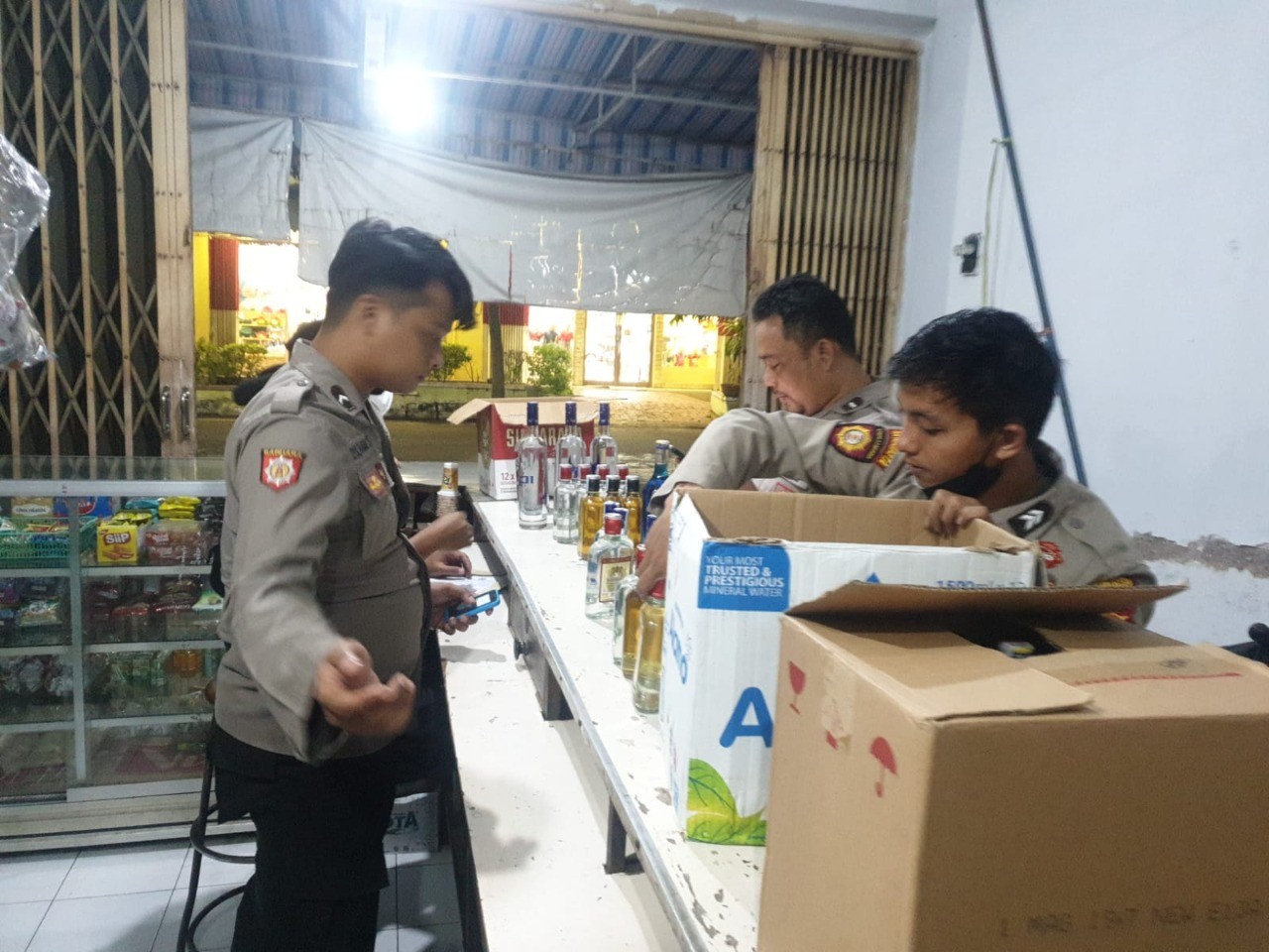 Patroli Samapata yang dipimpin Aipda Feri langsung menuju lokasi salah satu toko di jalan Irian Jaya kemudian melakukan pemeriksaan dan menemukan miras berbagai merk.