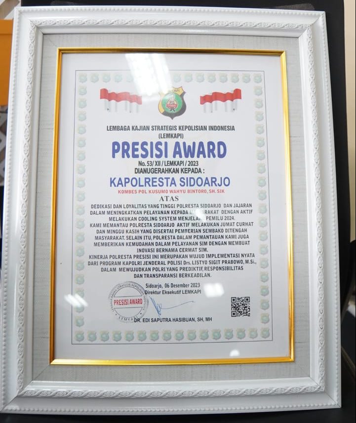 Apresiasi dari Lemkapi tersebut berupa Presisi Award yang diserahkan Direktur Eksekutif Lemkapi DR. Edi Saputra Hasibuan SH., MH. kepada Kapolresta Sidoarjo Kombes. Pol. Kusumo Wahyu Bintoro, Rabu (6/12/2023) di Ruang Parahita Raksaka Satlantas Polresta Sidoarjo.