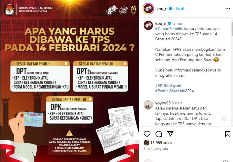 Faktanya, Informasi tersebut tidak benar. Dilansir dari Instagram resmi Komisi Pemilihan Umum Republik Indonesia (KPU RI), mengatakan jika Pemilu 2024 masih menggunakan form model C pemberitahuan/ undangan fisik.