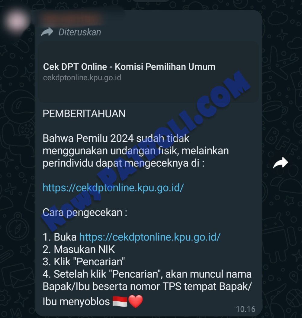 Beredar informasi di WhatsApp Grup yang menginformasikan jika Pemilu 2024 tidak lagi menggunakan undangan fisik. Pada pesan tersebut dijelaskan bahwa Komisi Pemilihan Umum Republik Indonesia (KPU RI) tidak membagikan undangan fisik lagi, namun diganti dengan mengecek secara mandiri di laman https://cekdptonline.kpu.go.id/.