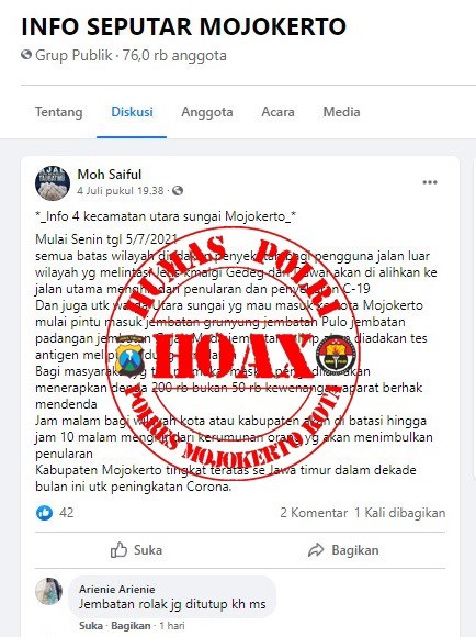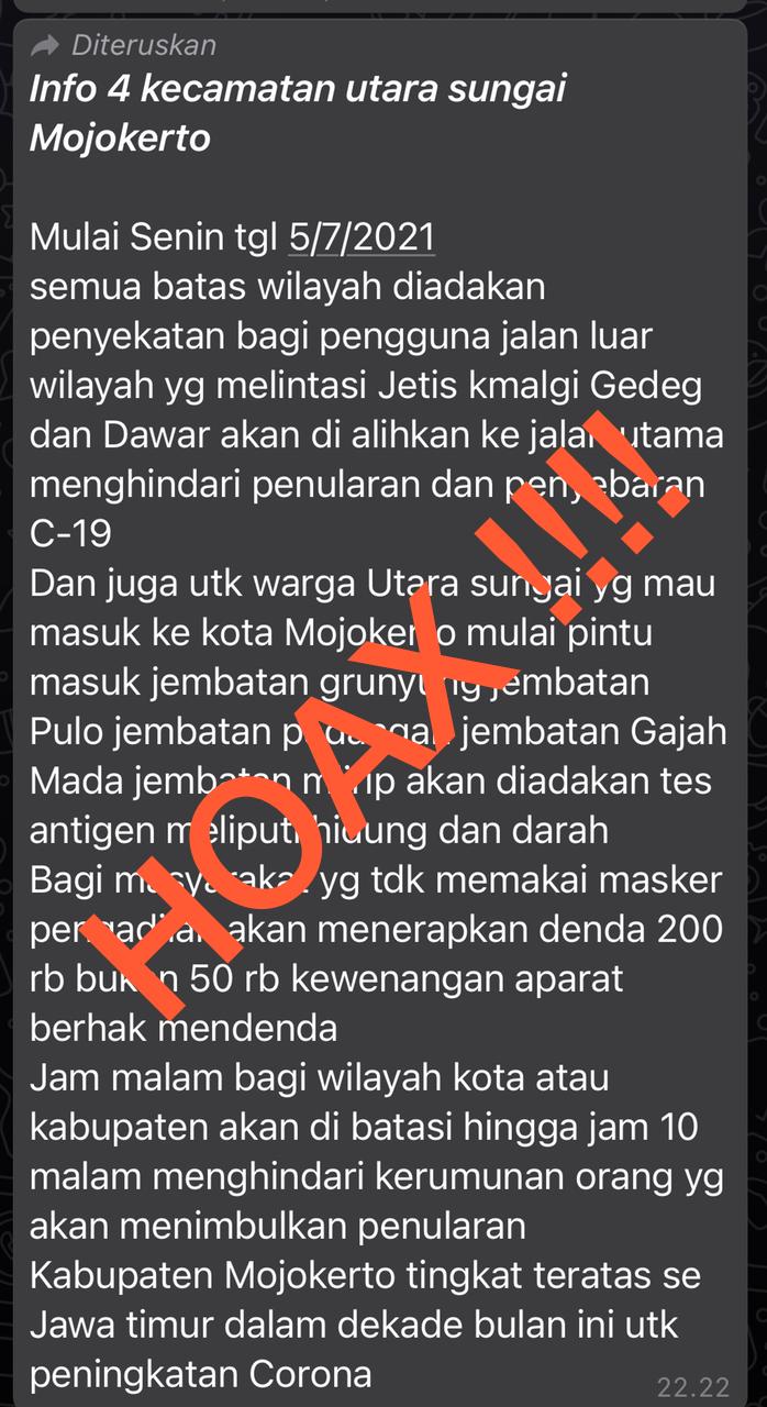 Pesan berantai melalui WhatsApp informasi soal 4 Kecamatan yang berada di Utara sungai Mulai Senin Tanggal 5/7/2021, apabila akan menuju Kota Mojokerto bakal di Tes antigen mulai pintu masuk jembatan Grunyung jembatan Pulo, jembatan Padangan, jembatan Gajah Mada, dan jembatan Mlirip, ini ternyata Hoax alias bohong.