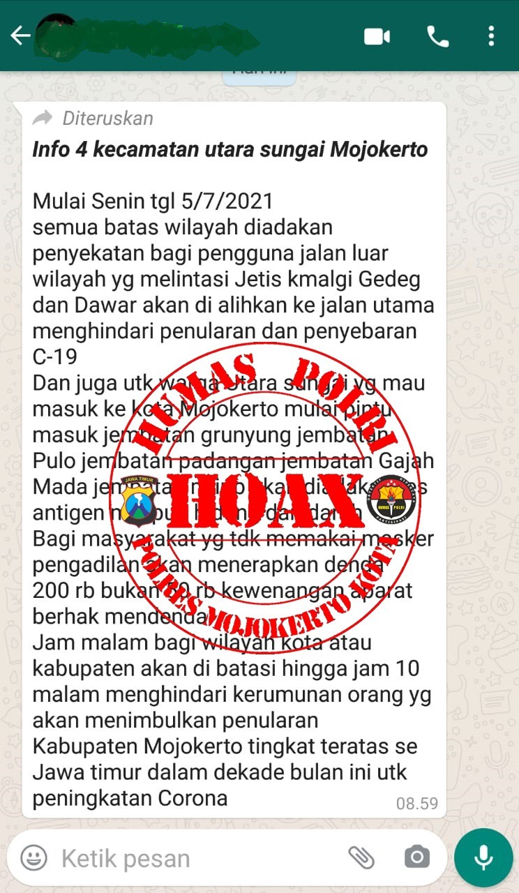 Pesan berantai melalui WhatsApp ini langsung ditepis oleh Kasubag Humas Polresta Mojokerto IPDA MK Umam SE, bahwa itu bohong.