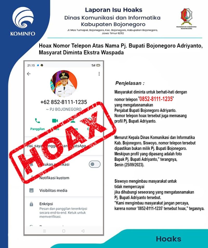 Masyarakat diminta untuk berhati-hati dengan nomor telepon ‘0852-8111-1235’ yang mengatasnamakan Penjabat Bupati Bojonegoro Adriyanto. Nomor telepon hoax tersebut juga memasang profil Pj. Bupati Adriyanto.