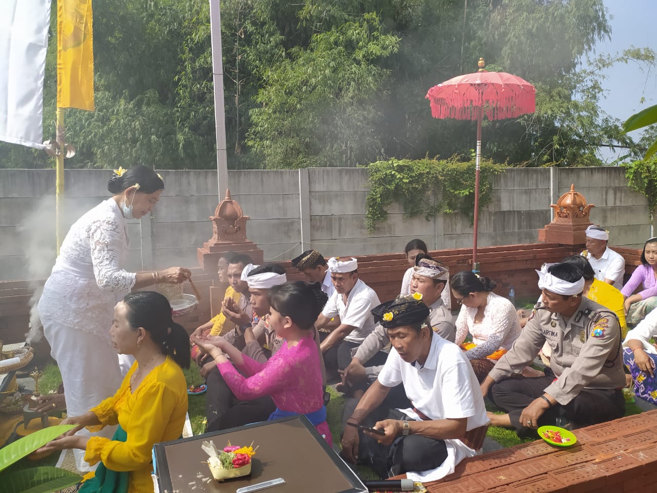 Kegiatan ibadah dipimpin Pandite Agung Mertayasa. Ia bersyukur atas rampungnya pembangunan Pura Kertha Bumi Bhayangkara. Sehingga dapat ditempati ibadah.