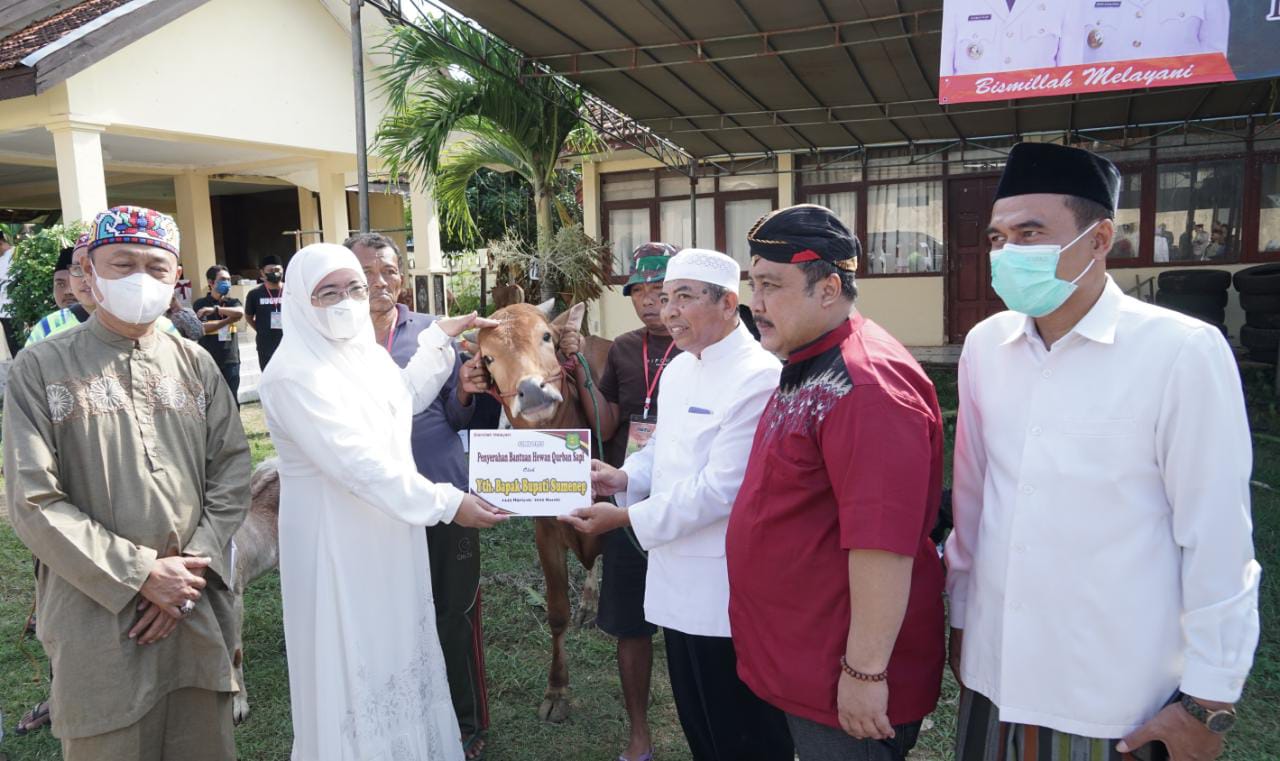 Wakil Bupati Sumenep Hj. Dewi Khalifah secara simbolis menyerahkan hewan kurban Iduladha 1443 Hijriah atau 2022, di Rumah Perlindungan Sosial Dinas Sosial Desa Pabian, Kecamatan Kota, Kabupaten Sumenep, Minggu, (10/07/2022).