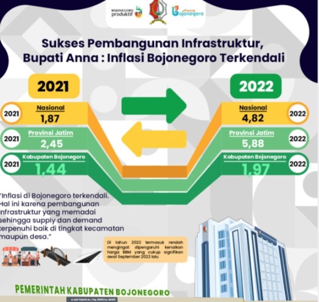 Sedangkan untuk angka inflasi Bojonegoro tahun 2021 sebesar 1,44 juga lebih rendah dari nasional sebesar 1,87 dan provinsi Jatim sebesar 2,45. Perubahan angka inflasi Bojonegoro dari 1,44 di tahun 2021 menjadi 1,97 di tahun 2022 termasuk rendah mengingat dipengaruhi kenaikan harga BBM yang cukup signifikan awal September 2022 lalu.