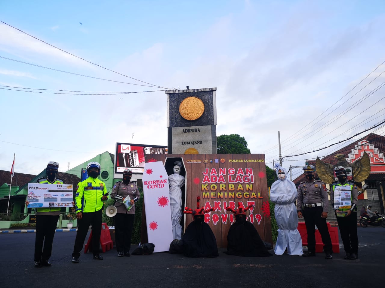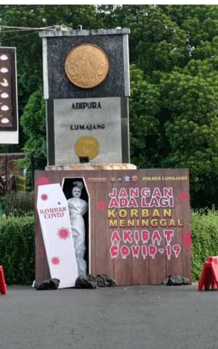 “Mengingat masih tingginya mobilitas masyarakat, maka kami melakukan upaya lain yaitu dengan cara memasangkan media boneka dan peti jenazah di depan Adipura sebagai visualisasi kepada para pengguna jalan dan masyarakat yang melihat, supaya selanjutnya lebih peduli lagi,” ucapnya melalui Paursubbag Humas Ipda Andrias Shinta.